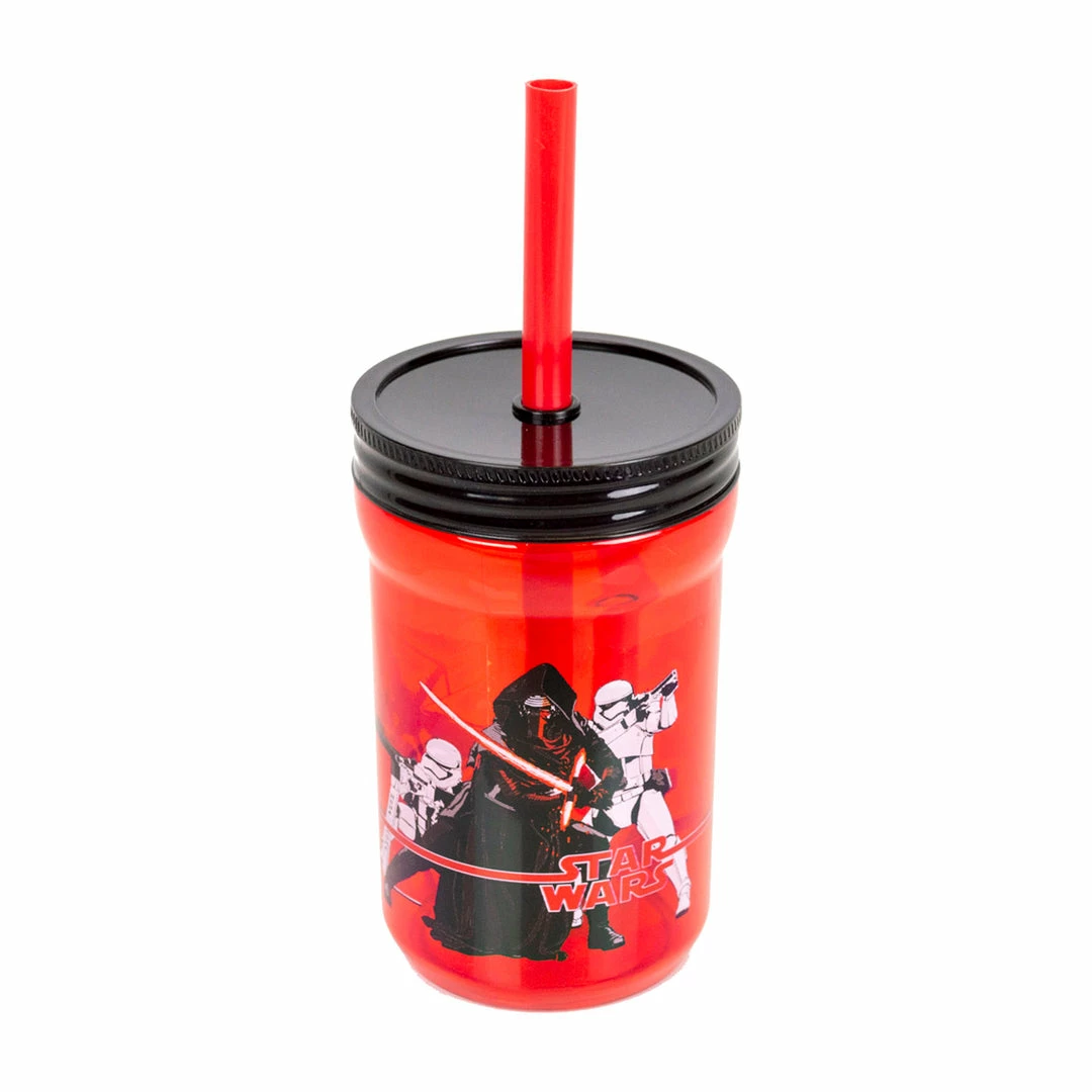 The Star Wars Mason Mug has a screw-on lid with straw and sturdy handle.ย It holds approximately 420 ml of liquid and itโs easy to use and clean.ย Great for everyday use whether at home or school!