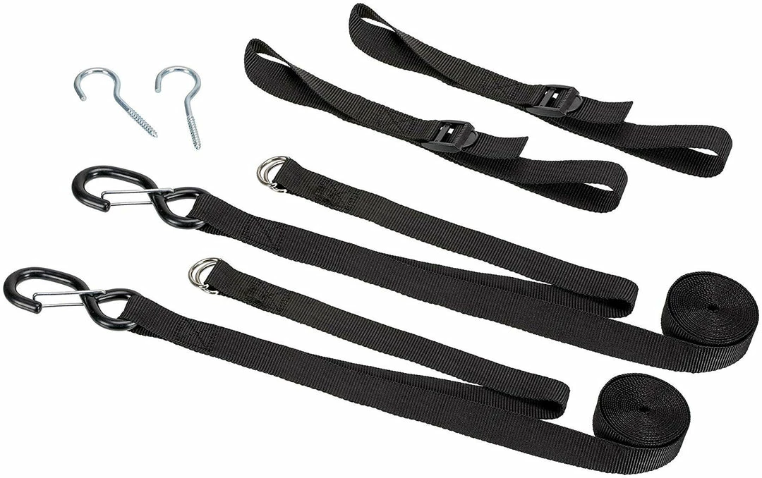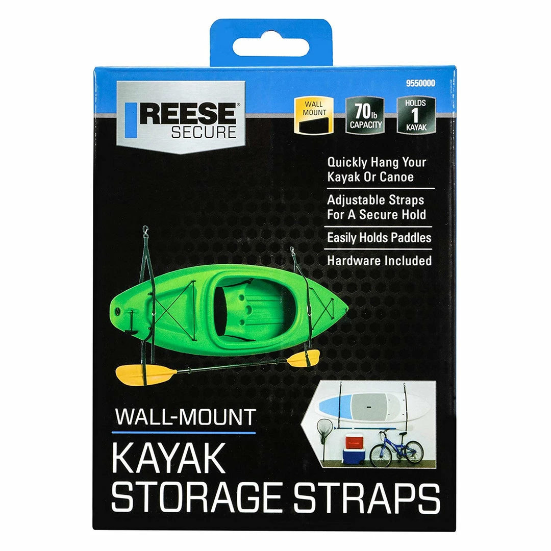 REESE Secure wall-mount kayak storage straps give you a simple way to store a kayak or other large item on the wall of your garage or shed. The straps are made from strong polypropylene and the buckle allows you to adjust the height of the straps. The kayak storage straps can be used to store a kayak, canoe, ladder, or other large item on the wall of your garage.