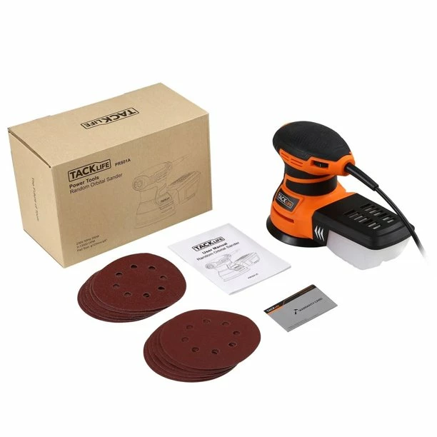 Easily sand and and smooth your wood shop projects with a Tack Life Orbital Sander! This 5″ sander has you ready to go straight out of the box with 12 included sanding discs in 80 and 180 grit. The sander features 6 adjustable speeds up to 13000 orbits per minute, a rubberized ergonomic palm grip, easy to reach on/off switch, and a dust collecting compartment.