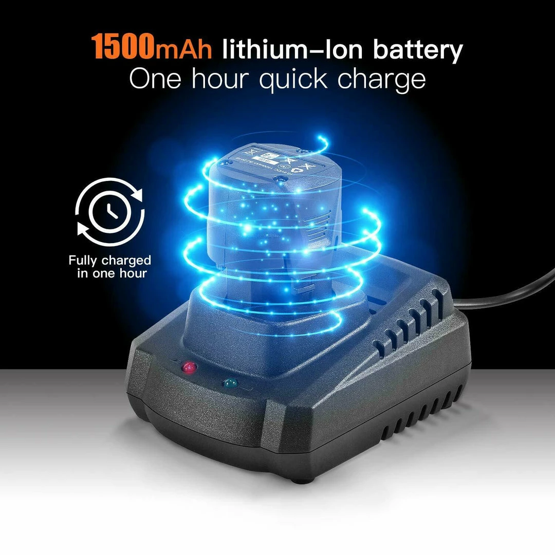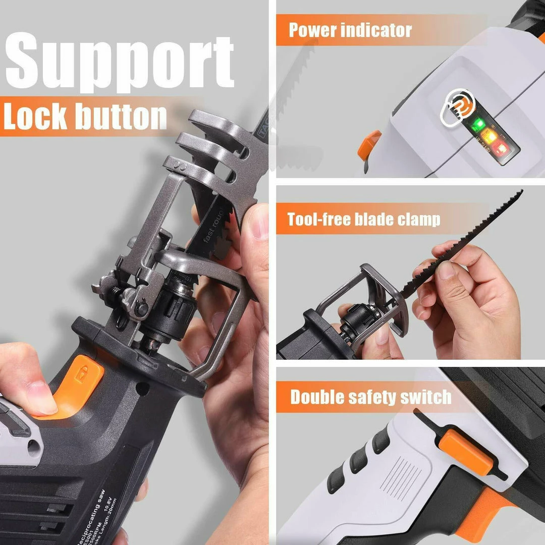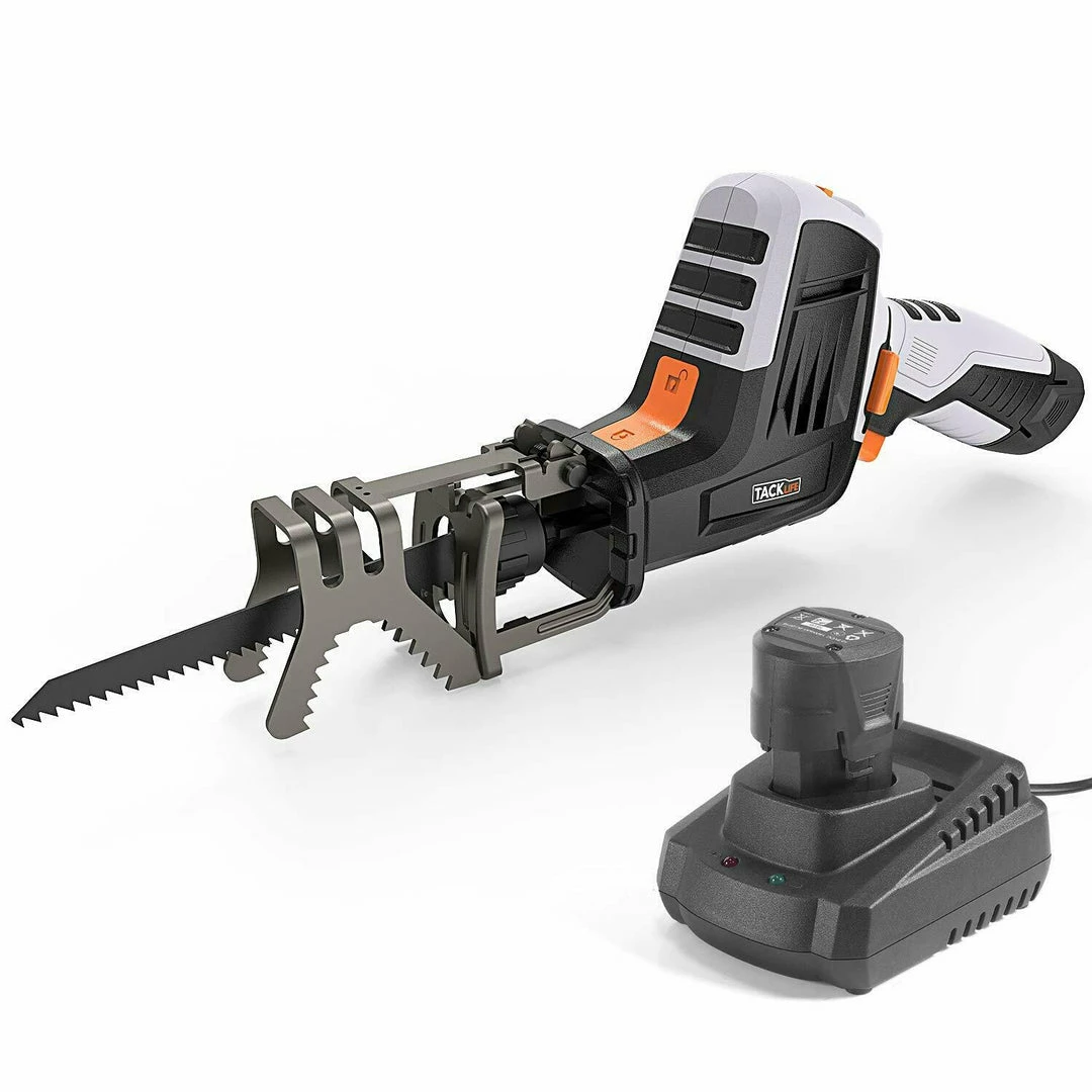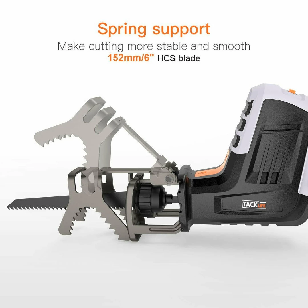 Trim branches, pipes and more with a a Tacklife Reciprocating Saw! This saw comes packed with essential features, including a lock button, power indicator, tool-free blade clamp, and a double safety switch. It has a 1500mAh lithium-ion battery and even includes a charger, lasting up to 30 minutes and charging in as little as an hour.