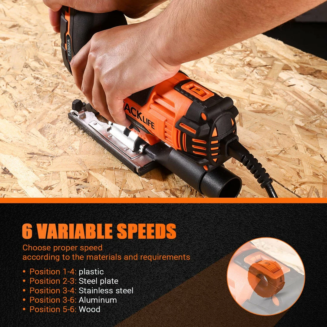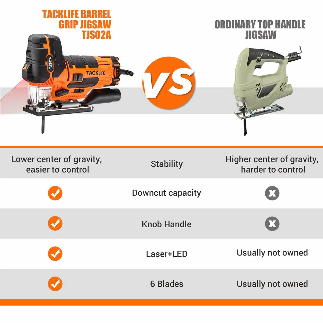 Get precise cuts on your wood-shop projects with a Tacklife Jigsaw! This saw has a barrel grip, giving it a lower center of gravity and offering more stability than traditional grip saws. It has a 6 speed dial and 4 orbital settings, going from 0-3100 RPM and adjusting from a 0-45ยฐ angle. The saw also features an LED laser for increased accuracy, a dust extraction adapter (attaches to vacuum), and includes 6 blades and a carrying case.