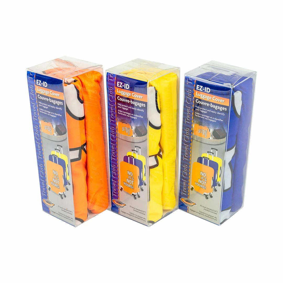 Find your bag, and have a smile, with this Travel Club Luggage Cover. Donβt strain yourself trying to find your luggage amidst an endless sea of greys and blacks; these bright blue, orange, or yellow luggage covers arenβt just good, cheeky fun, they also make identifying your luggage a cinch. Thatβs not to say they donβt have practical uses beyond locating your stuff in the baggage claim; far from it. Providing an extra layer of security against theft and tampering, it also protects the surface of your luggage when itβs out of your hands. The four-way stretch lyrca spandex fits most 20β carry-on luggage, and is machine washable, so worrying about spills is a thing of the past. Stand out from the crowd: with Travel Club.