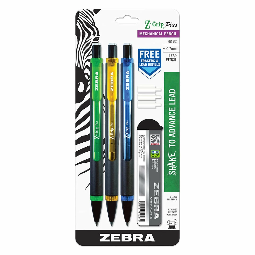 Zebra Z-Grip Plus Mechanical Pencils make writing easy, comfortable, and fun! They use shake technology to let you push lead out with a little shake- minimizing your change for breakage. This value set includes 3 HB #2 0.7mm mechanical pencils in assorted colors with eraser and lead refills.